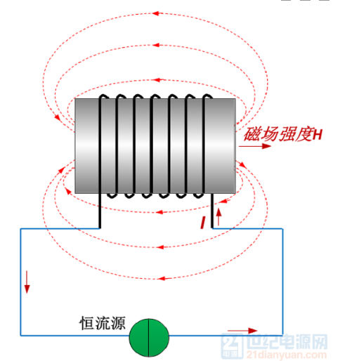 注意:電路中這里對電感線圈施加的是恒流源,而不是電壓源。這個磁化場 H 將對磁芯中的每一個磁疇施加一個磁力矩,使這些磁疇在宏觀上轉(zhuǎn)向磁 場方向排列起來,這樣磁芯整體會對外顯磁性。